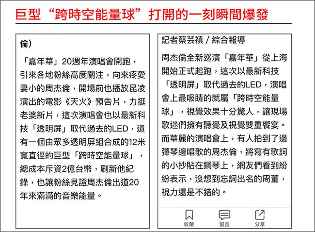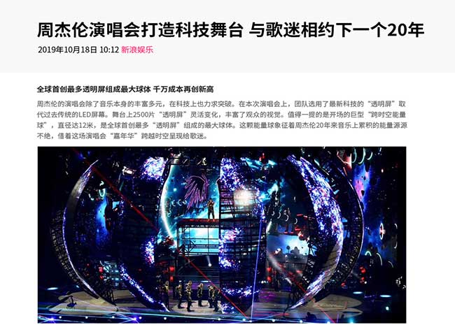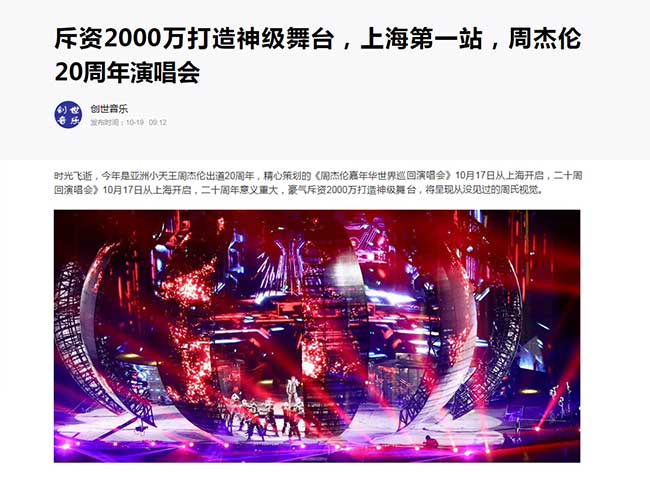 虽然「嘉年华」演唱会上海站已落下帷幕,但对这次由星空游戏(中国)科技有限公司官网(股票代码:837293)制造安装的12米高,10米宽的巨型「跨时空能量球」P10球形屏和最新研发产品「龙系列—龙腾禧」透明屏打造的高科技豪华舞台,显示屏的镂空设计和透光透风设计为舞台表演营造出更加绚烂多彩的气氛,恰到好处的为音乐演唱表现形成了一个很好的延展。现在「跨时空能量球」持续引起各界人士热议和追捧。请看来自各大媒体的官宣报道。